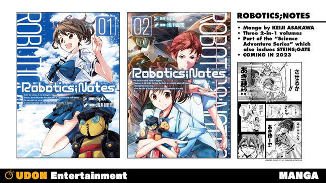 Udon Entertainment will release pb. and Keiji Asakawa's Robotics;Notes manga adaptation of 5pb.'s third Science Adventure series (after Chaos;HEAd and Steins;Gate) in three 2-in-1 volumes, starting in 2023.