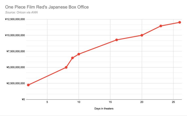 The One Piece Film Red anime has sold 8,618,377 tickets to earn 12,015,143,970 yen (about US$86 million) as of Wednesday, its 26th day in Japanese theaters.