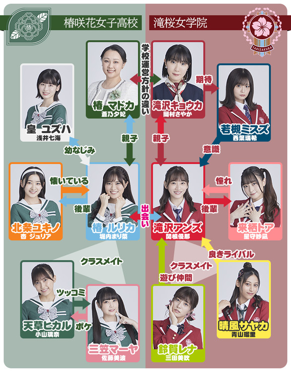 Former top Takarazuka actress Yuki Aono plays Madoka Tsubaki, Tsubakisakuhana's chair and Rurika's mother. Sayaka Okamura plays Kyōka Takizawa, Takizakura's chair and Anzu's mother.