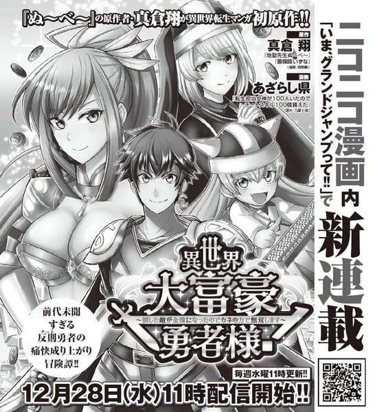 The official Twitter account of Shueisha's Grand Jump magazine announced on December 26 that manga creator Shō Makura's new manga titled Isekai Daifugō Yūsha-sama: Taoshita Teki ga Kinkai ni Natta node Kane no Chikara de Musōshimasu (Millionaire Hero in Another World: Defeated Enemies Turn into Gold Nuggets So My Money Power is Unparalleled) launched on the "Ima, Grand Jump!!" (Grand Jump Now!!) section of the niconico Manga website on December 28.