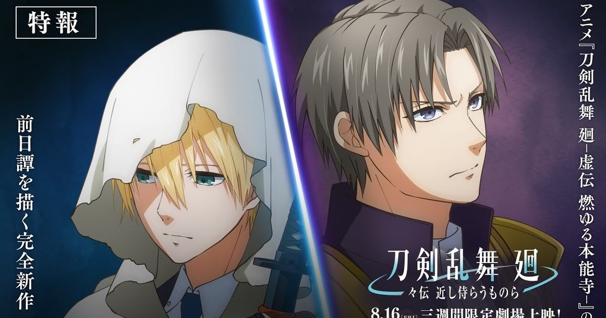 The official website for Touken Ranbu Kai: Kyoden Moyuru Honnōji, the anime adaptation of the Touken Ranbu Kyoden Moyuru Honnōji stage play, revealed on Tuesday that a prequel anime titled Touken Ranbu Kai -Dо̄den Chikashi Haberau Monora- will screen in theaters in Japan for three weeks only, starting on August 16. The website unveiled a trailer and visual: