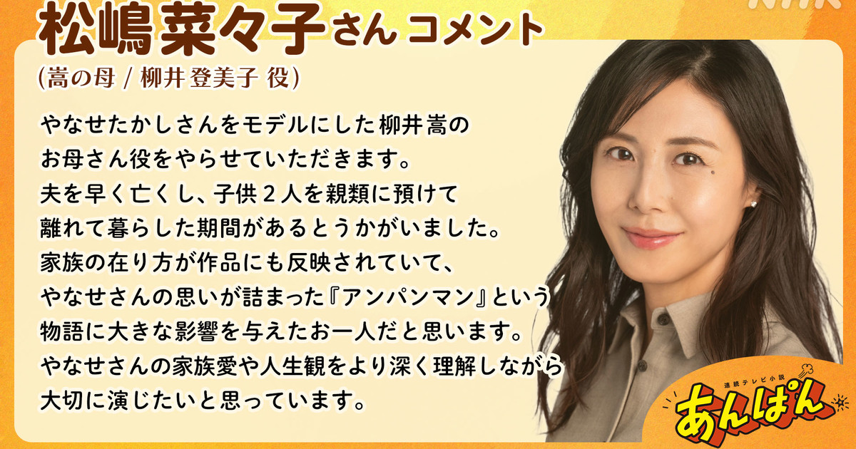 NHK revealed on Friday more cast members for Anpan, the newest entry in its six-decade-long Renzoku Terebi Shōsetsu (Serialized TV Novel, also known as "Asadora" or Morning Drama) franchise. The new live-action weekday morning series is inspired by the life story of Anpanman manga creator Takashi Yanase and his wife Nobuo Komatsu.