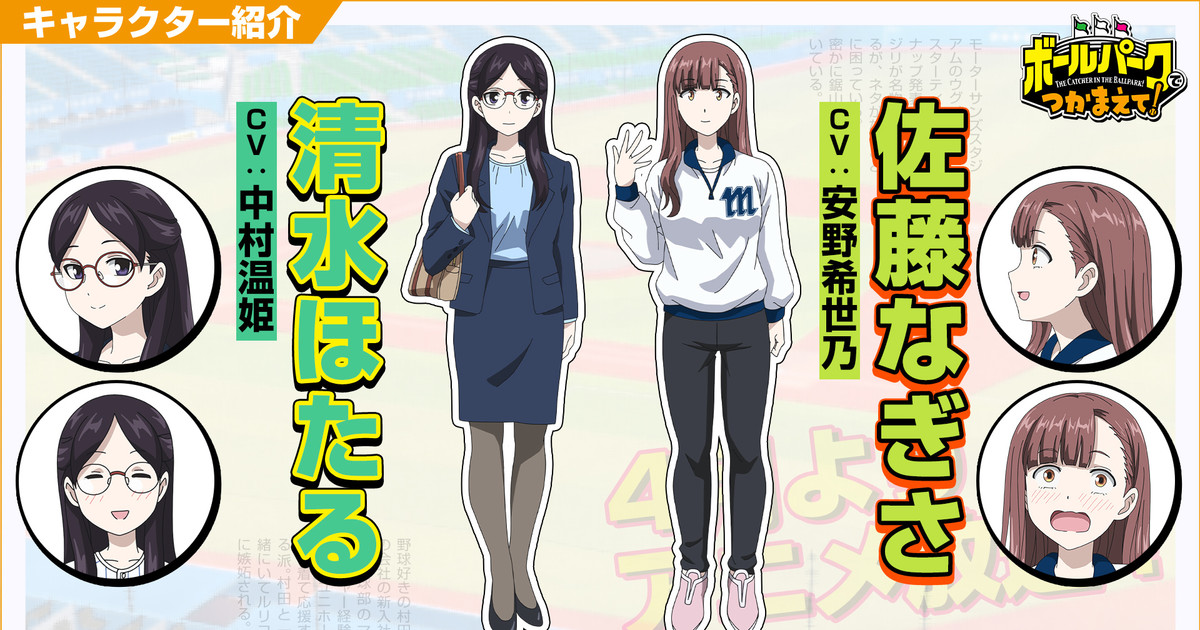 The official X/Twitter account for the television anime adaptation of Tatsurō Suga's The Catcher in the Ballpark! (Ballpark de Tsukamaete!) manga revealed on Thursday that the series has cast Kiyono Yasuno as Nagisa (pictured below on right), announcer at Motorsun Stadium, and Atsuki Nakamura as Hotaru (pictured below on left), Murata's new coworker who loves baseball: