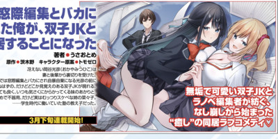 The April issue of Kadokawa's Monthly Comic Alive magazine revealed on February 27 that Usa Otome will launch a new manga titled Madogiwa Henshū to Baka ni Sareta Ore ga, Futago JK to Dōkyo Suru Koto ni Natta (After Getting Mocked for Being a Sideline Editor, I Ended Up Living With Twin High School Girls) on the Comic Alive+ website in late March. The manga is an adaptation of Ibarakino's light novel series of the same title.