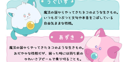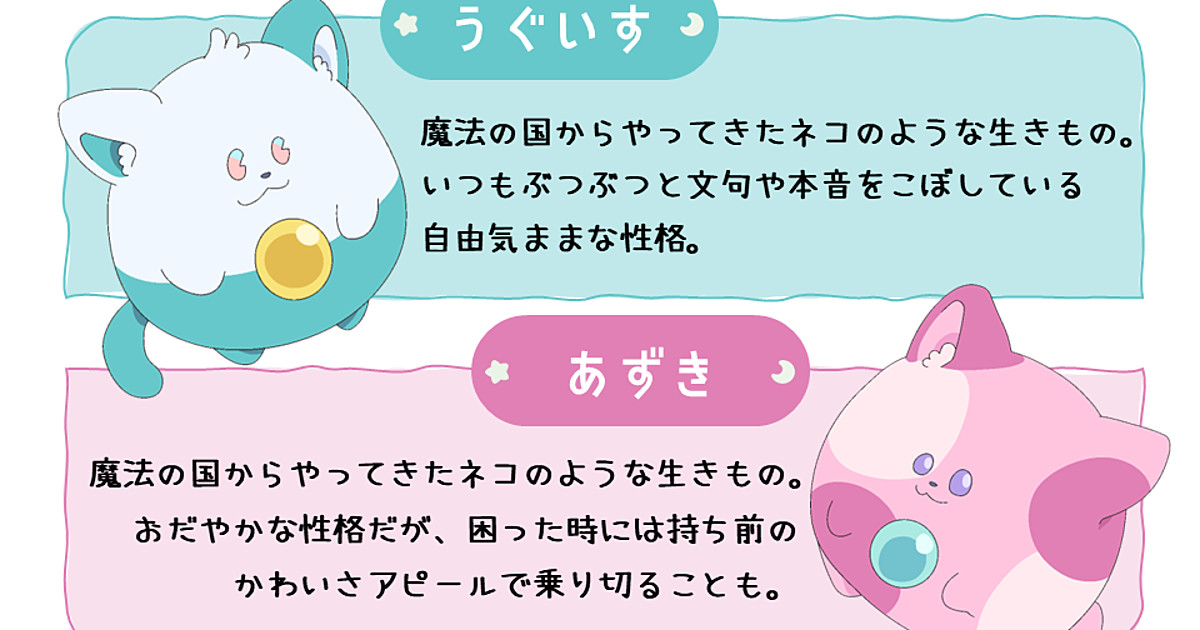 The announcement also revealed two cat-like characters from the anime, named Uguisu (top in image below) and Azuki. The two characters are both from a "land of magic." Uguisu is a free spirit who speaks their mind constantly, which includes complaining and grumbling. Azuki is usually calm, and has a knack for using their natural charm to get through trouble.