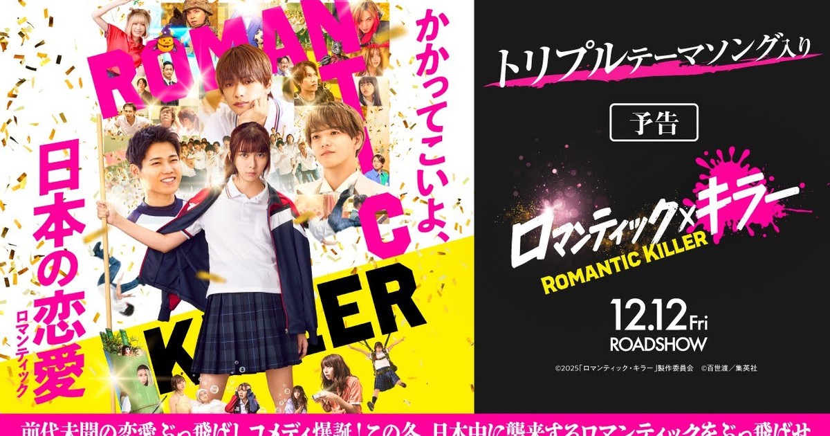 The official website for the live-action film of Wataru Momose's Romantic Killer manga unveiled a trailer and a new poster visual on Friday. The trailer reveals more cast members, as well as three different theme songs for the film. Naniwa Danshi perform a "miracle theme song" titled "Never Romantic," while INI performs an "aoharu (springtime of youth) theme song" titled "True Love," and FANTASTICS perform a "kyun love (love at first sight) theme song" titled "Zutto Zutto."
