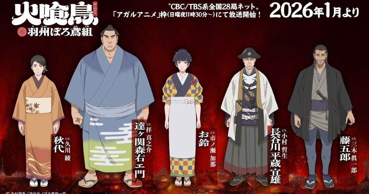 The official website for Oedo Fire Slayer -The Legend of Phoenix-, the television anime adaptation of Hikuidori (Fire Eater), the first volume from Shōgo Imamura's Ushūboro Tobigumi historical novel series, revealed 10 more cast members for the anime on Friday.