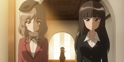 In the short, Shiho Nishizumi and Chiyo Shimada cross paths inside the Sensha-Dō Federation building, and there is once again a strange tension between them. However, they both suddenly hear the sound of geta (Japanese traditional wooden sandals), and they immediately start to run away, but are caught by a certain woman.