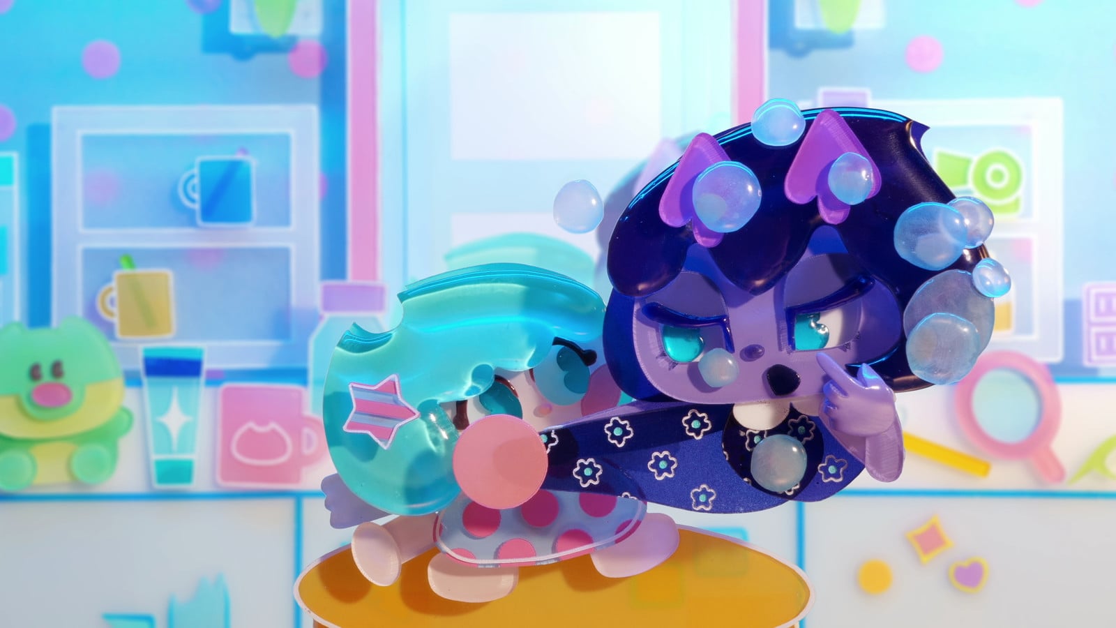 According to Misato, he used plastic board and acrylic for Candy Caries, and describes it as a semi three-dimensional animation that's "flat like an illustration, but plump and thick."