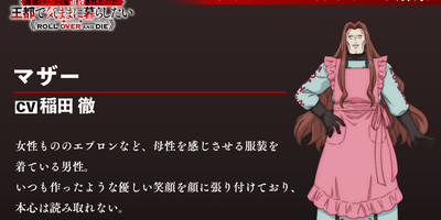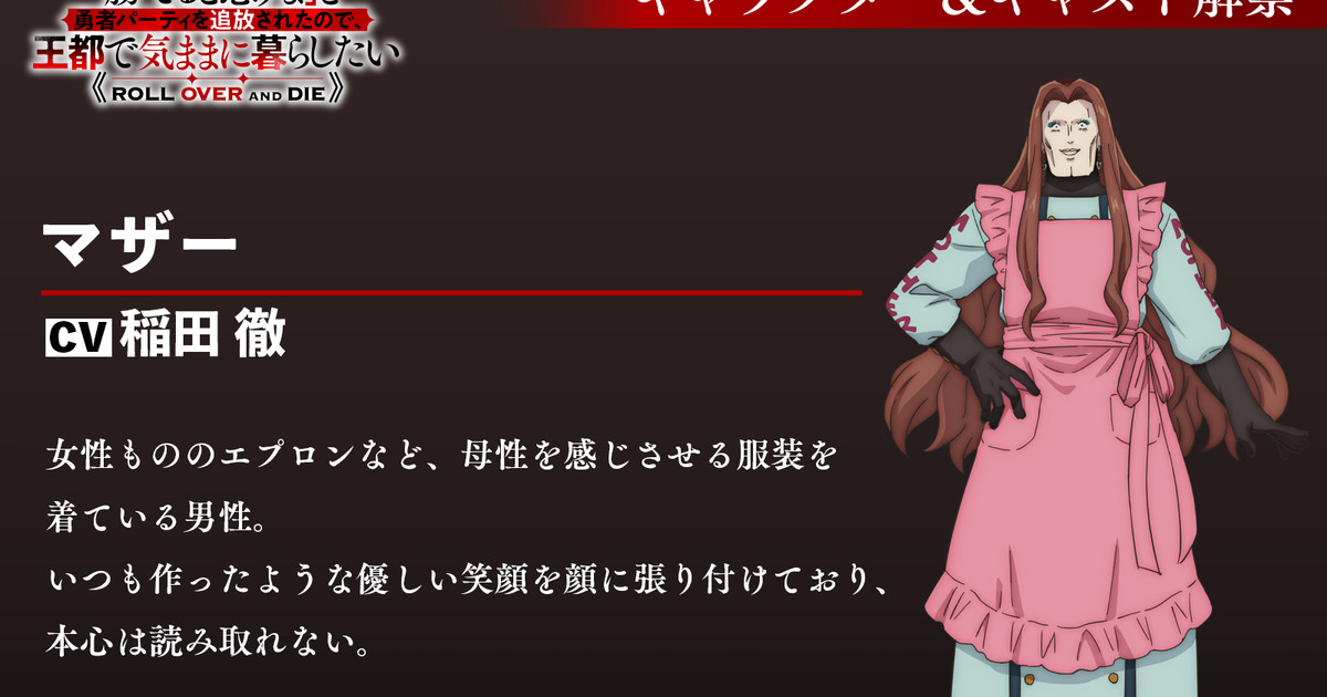 The staff of the television anime based on writer kiki and illustrator Kinta's ROLL OVER AND DIE: I Will Fight for an Ordinary Life with My Love and Cursed Sword! ("Omae Gotoki ga Maō ni Kateru to Omou na" to Yūsha Party o Tsuihō Sareta node, Ōto de Kimama ni Kurashitai) light novel series announced on Tuesday that Tetsu Inada will voice the character Mother, who will appear in the anime's 12th episode on Thursday. Mother is a man who wears an apron and evokes a sense of motherhood. He always wears a forced, gentle smile, making it hard to read his true emotions.