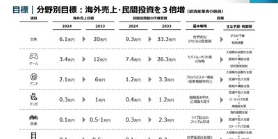 The government similarly aims to increase the game industry's overseas market from 3.4 trillion yen (about US$21 billion) to 12 trillion yen (about $75 billion) by 2033. Its basic strategy is helping Japanese companies acquire more of the mobile and PC markets, by supporting the production of releases at a large scale and the construction of development platforms, as well as tax incentives for research and development.