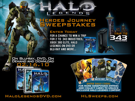 The sweepstakes features a Grand Prize for one (1) lucky winner plus one (1) guest to take a 3-day/2-night journey of their own to 343 Industries in Redmond, WA for a private screening and a chance to meet some of the creative team behind Halo Legends. In addition, the Grand Prize winner will receive an Xbox 360 Elite and Halo Legends on 2-Disc DVD or Blu-ray. There will also be three (3) First Prize winners who will receive an Xbox 360 Elite and a Halo Legends on 2-disc DVD or Blu-ray. Ten (10) Second Prize winners will receive a Halo Legends standard edition DVD. The sweepstakes is open to all residents of the United States and Canada (excluding Quebec).