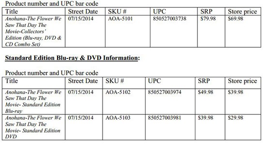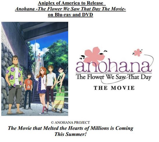 SANTA MONICA, CA (May 24, 2014) –Aniplex of America announced earlier today their plans to release anohana: The Flower We Saw That Day The Movie- on both Blu-ray and DVD on July 15th. This movie adaptation of the popular original anime series will be featured in a Collectors' Edition (Blu-ray, DVD & CD Combo Set), Standard Edition Blu-ray, and Standard Edition DVD. Pre-orders for all SKUs will begin on May 27th and will be available in the U.S., Canada, Central and South Americas.