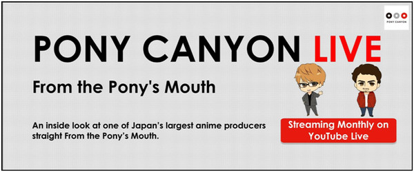 PONY CANYON LIVE is a monthly YouTube live stream direct from our headquarters in Tokyo where we will talk about all things PONY CANYON. Every month we will feature various animation industry guests. Fans will get to hear from our talented producers about what they're working on right now and their history in the industry. This is a chance to communicate directly with fans all over the world about the work we do, to answer your questions, and give you a peek inside the industry like never before. No longer will fans be stuck watching from a distance. This is straight From the Pony's Mouth.