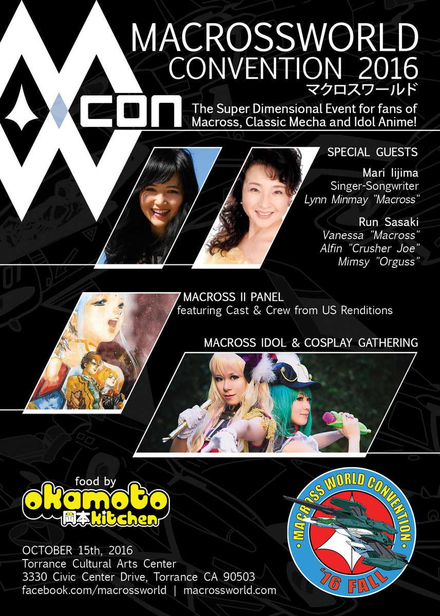 MacrossWorld Convention 2016 will be held at the Torrance Cultural Arts Center in Torrance, California on Saturday October 15th. The US Renditions cast and crew join previously announced Guests Mari Iijima (Lynn Minmay, Macross) and Run Sasaki (Vanessa, Macross).