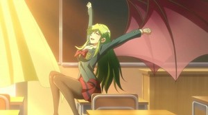 There is a kind of nice understory to this show, although how it is executed leaves something to be desired. High school student Asahi is known among his friends as a “leaky basket,” incapable of keeping a secret to himself – they just leak out through his mouth. Even when he's sure he's kept it tightly locked away, like his crush on mint-haired beauty Youko, it turns out that everyone's known all along. In a surprise (for him), Youko turns out to be the one person who hasn't noticed, although she's been keeping a secret of her own: she's a vampire. When Asahi goes to confess, he finds her stretching her bat wings and ends up promising to keep her secret and be her friend so that she won't have to leave school. How well this works out remains to be seen.
