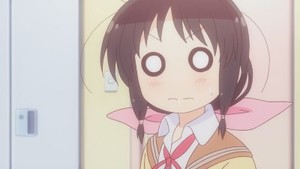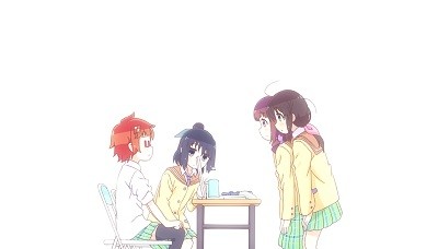 The first episode also stands out artistically, though whether or not that's for good reasons is another matter. It uses an exceedingly light, pale color scheme which suggests warmth and softness but which can also make the artistry seem washed-out. Background art is minimized, to the point that characters are sometimes animated in front of a blank, white screen. The character designs and animation are all crisp, clean, consistent, and suitably cute, though I did find it odd that the girls all look like they're still in middle school (if that!) even though they are supposed to be high school students. A gentle but unexpectedly effective musical score is also a great enhancement.