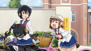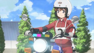 The other component is, of course, the love affair with bikes. Both the writers and the artists seem to be showing off their depth of knowledge concerning the machines, whether it be the licensing procedures, the different types of bikes, or the meticulously-detailed animation of how they work, down to the smallest detail. In fact, the technical merits overall are quite sharp; this is easily one of the best-looking series of the season so far. Spicing that up is an unexpected level of visual fan service. Oh, the girls all keep their clothes on, but the prominent figures of some of the girls get quite a bit of attention, especially Rin, who is so much bustier than characters of her base design normally are that her bust line sticks out even more than it normally would. Frankly, the series has enough else going for it that it didn't need to go there, so I actually think it's more of a distraction than an enhancement in this case.