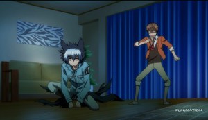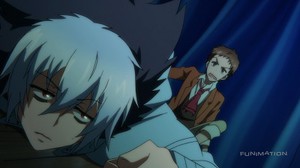 The whole approach the series takes, and the style that it uses, enough resembles that of Akame ga KILL! (whose source manga starting 15 months before Servamp's did) that I have to think that there's some direct influence that KILL has on Servamp. That means characters suddenly either appearing or flipping into crazed mode to unleash bloody havoc, typically with exaggerated wicked grins on their faces, and the magician-vampire who appears to attack Mahiru and his friends fits that bill quite nicely. It also sports the same whipsaw shifts between Comedy Mode and Serious Mode. The cut-rate fight animation also has a similar feel to it. None of these similarities should be considered favorable for this series, either, as KILL mildly succeeded despite them rather than because of them.