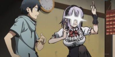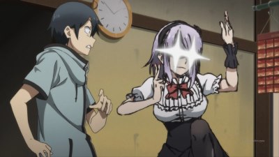 Grounding the episode in the normal realm is the fledgling romance which may or may not be afoot between Kokonotsu and Saya, the girl who helps runs her family's café in his small town. She doesn't want to admit how much she like him and he's oblivious. Kokonotsu suffering through his father's efforts to get him to continue the long-standing tradition of the family snack shop is also not so unusual, nor is the ridiculousness that someone like Kokonotsu's father is well-known enough to be recruited. What puts it in a slightly different realm is the manic energy of Hotaru. That isn't so abnormal, either, but it's the way she uses it. She's a walking assemblage of weirdness, one possessed of enough bizarre little quirks to stock the entire cast of a comedy series. One minute she might be describing her mission like a fantasy video game quest; the next she acts like she's doing a commercial for one of her family company's products. As often as not she makes very little sense, which other characters comment on repeatedly, but that doesn't stop her.
