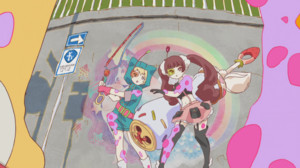 Whether or not this oddball variation on the basic magical girl formula will have much appeal on that level or beyond is another story. The characters are simple and straighforward, with the only thing in the first episode that passes for depth being that one of the girls is avoiding having to deal with her divorced parents. Still, the girls are a likable enough balance of starkly different personalities, and their design talent is no joke. When they transform into magical girl form (sort of), they gain abilities in line with their personalities. Their ultimate defense also somewhat makes sense, as a giant parfait that they collectively designed.