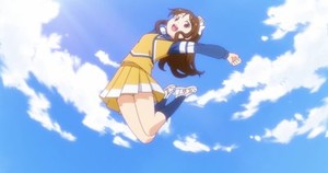 The story itself is fairly familiar. Kohane, who has no real direction in her life beyond “helping others,” discovers cheerleading by accident and realizes that it's pretty much everything she wants in a sport – (apparently) non-competitive, cooperative, and with the goal of helping others to do their best. That the uniforms are cute and the dancing and acrobatics impressive are the icing on her cake; Kohane becomes obsessed with impressive rapidity. But wouldn't you know it, her new high school doesn't have a cheerleading squad, so now Kohane has to round up four other girls to make her dream happen. It's way too convenient that Hizume, one of the girls she saw before, just so happens to also be a first year at her school, and it's totally expected that Hizume is actively trying to put cheer behind her.
