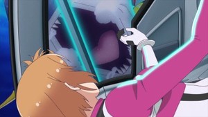 Characters aside, this episode remains a bit of a mess. Even leaving science out of it, the plot seems to wander around too long before finally getting where it wants to be, and its game roots are really all too clear. There's nothing that says that a good anime can't be made out of a very simple game – Puzzle & Dragon X is a good example of it done well – but this one seems to function as if it's giving players instructions once Haru's in her flying fish, and the use of an app smacks of advertising rather than using current technology to fuel a plot point. The fact that the giant crab also has a name that sounds more like a monster in an RPG than anything you'd call an actual giant crab simply compounds the issue.