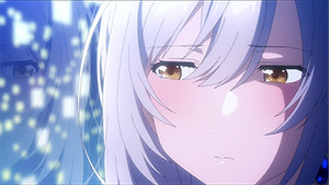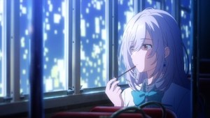 But this episode has way more going for it than that. It's also a visual wonder, with the wealth of fine background detail that P.A. Works series have become known for over the past decade, with a visual feast of beautiful colors when the camera isn't looking through Hitomi's eyes. The alternations between her black-and-white worldview and what everyone else sees provide a stark contrast that helps firm up her personality, but that's nothing compared to the eye-popping visuals when her monochrome world suddenly bursts with painted colors in a fantastic scene at the end of the episode. Also watch for the gradual color shifts in the closer and next episode preview, too! Distinct character designs that are at least slight departures from stock designs populate the cast so far, with Hitomi's height and stature making her stand out compared to other emotionally stunted, pale-haired anime girls. The extent and quality of the animation is also well above average, and the musical support matches the action well.