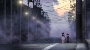 The show opens with atmospheric pillow shots implying a cohesiveness of tone and vision that never really lets up. From the first minute, whose saturated lighting and overbearing long shots perfectly convey the sense of a stifling summer afternoon, we move to an apartment where our hero is waking, in a scene whose intimacy is equally well-captured through great storyboards and precise sound design. As the episode continues, our introduction to the amnesiac Yuta's life is grounded not through the relatability of his life circumstances, but the immediate tangibility of his lived experience. Subdued scenes at school actually reminded me of Gainax icons like Evangelion in their ability to capture stiff and quietly alienating moments, as well as their use of painfully long-held shots and radio announcements as a tonal break. Even if we weren't continuously being fed small indications of fantastical danger, these scenes all possess an inherent sense of tension and dramatic import. Moments like Yuta and his friend Rikka trudging home underneath power lines, fog, and a distant kaiju are their own reward, visual and tonal jewels that effortlessly draw us into Gridman's world.