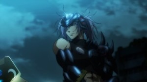 Certainly the storytelling succeeds at making this a more mature and involved story. The first episode suggests political movements well above the heads of our heroic duo while they scrape by on jobs that would make them adventurers were the setting a fantasy RPG, although one of the last scenes in the episode indicates that they're about to get drawn into that fray. Meanwhile, a serial killer is hunting down their kind with some ill-defined revenge motive. On top of that, the more responsible of the two protagonists is trying to keep the duo afloat financially (in no small part due to his partner's fiscal irresponsibility) and his girlfriend happy. Add a vaguely Western twang to the musical score, too, just to remind viewers that this isn't a series about high school-aged brats and you have a title which desperately wants to seem cool to older audiences.