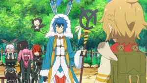 Okay, maybe there are slight bits of actual humor here, and it's not like the first episode doesn't try. Many common aspects of app-based games are prime material for comedy, particularly the whole “gacha” mechanism, including how it's often free the first time but you usually have to pay real money for your opportunities after that. One of the few worthwhile jokes involves how there's always some kind of fanciful spell, contraption, or other gimmick for adding a flourish to the gacha picks, and then for all of that flash you will commonly end up with a disposable return. If the series takes and runs with the one-star guy as a running joke, then that might amount to something creative. The guy with the weird five-star item was also a decent spoof.