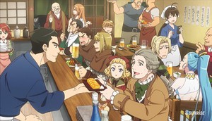 Isekai Izakaya – Each of this series' 15-minute episodes consists of about 10½ minutes of animation coupled with a roughly three-minute live action segment; the first episode features cooking one of the items shown in the animation, while the second shows a Japanese actor visiting an izakaya that specializes in the kind of chicken dish shown in the episode. The premise of the animated parts of the show is simple: residents of another world come into the establishment and become amazed at basic Japanese food and drinks, to the point that they have visions of gods (based partly on wordplay) and fairy tales as they enjoy the succulent tastes of food and drink. There's no sign of development for these characters or their individual stories. The show can be funny, but this is mostly for foodies and not helped by being styled somewhat like a variety show. Restaurant to Another World has already done this concept better.