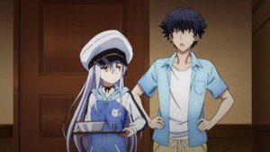 This episode accomplishes the two things that it absolutely must for the series to have a chance of succeeding: it makes the main trio of girls endearing enough and layers on some intriguing mysteries. Pale-haired Rinne probably isn't a vampire, but she has some kind of condition that forces her to keep out of direct sunlight and professes to be both a fellow amnesiac and fellow time traveler to the male lead. The poofy-haired shrine maiden Sara seems to have advanced science knowledge but also feels a need to (ineptly) try to kill the male lead, and twin-tailed Karen is the tsundere with the misfortune to trip and crotch-plant on the male lead when he's lying naked and unconscious on the beach. She also wants to get off the island badly enough to hide in a boat's cabinetry. Setsuna, for his part, keeps having disturbing flashes that suggest encounters with alternate versions of some of the girls. It's an intriguing enough web of interconnections to stoke some interest, and it also has the light touches of humor that have long been a hallmark of this type of story. (That's good, because the character interactions so far have been pretty banal.)