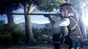It takes quite a while to actually reach this episode's big action scene, but at least that scene is an improvement over the content that comes before it. The highlight here may actually be the moment of calm before everyone starts shooting; there's some nicely understated tension in the air as the rookie musketeers steel themselves for the upcoming firefight, and this scene also shows off a fair amount of detail in the design and function of their weapons. The battle itself is a relatively mediocre affair, competent enough to hit the necessary story beats but not impressive enough to merit the attention of anyone outside the show's core demographic.