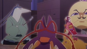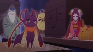 Tsukumogami aren't quite yokai, as the characters in this episode are quick to tell someone who thinks otherwise. They're objects that have been loved for at least a century and have developed souls. Siblings Okou and Seiji run a shop that, among other curios, rents out tsukumogami for a variety of slightly undercover purposes. Or at least, that's the impression I get from this episode – the tsukumogami are aware that the siblings know about them, but they seem to do their level best to ignore the two, preferring to indirectly talk around them (and get their information the same way) than to have actual conversations. It seems to indicate an uneasy partnership borne out of the fact that these were originally just objects someone loved – and then gave away.