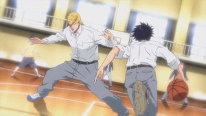What does make the first episode stand out so far is the visuals. The first episode looks remarkably sharp for a sports series, with well-drawn and suitably-rounded character designs across the board. To be sure, there's nothing unique about most of the designs; Sora is as generic as they come in appearance, while many of the other male basketball players look like they were copied from a guidebook on how to draw anime high school delinquents. Madoka, the female basketball player, is legitimately pretty but probably wouldn't stand out in a line-up either. However, generic can be fine if it's drawn as well as these. The animation also shows some potential by putting serious effort into properly animating the basketball moves that Sora executes in the one-on-five challenge at the end.
