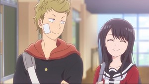 Like Joshi Kausei, Senryū Girl tries just a little too hard with its central conceit. This time it's that high school girl Nanako only communicates in senryu poems, a three-line format with a 5-7-5 syllable count. She explains it as she's got too much going on in her head to organize her thoughts and therefore has a hard time speaking, and senryu force her to make sense by making her adhere to a specific rhythm. I'm willing to buy that; we all have our own weird little coping mechanisms, after all. But thirteen minutes of senryu-based jokes is a bit much, especially since the friendship/romance between Nanako and her thuggish-looking classmate Eiji takes a back seat to it. This may develop into a cute romance or friendship story now that it's established the whole poem thing, but if it doesn't only fans of this specific form of verse may find much to enjoy.