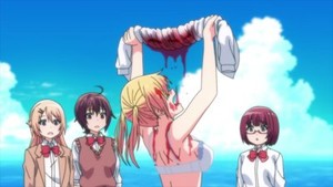 Most simply put, the two pieces of this story sit uneasily together. On a more personal level, I was hoping for something more in line with the manga Limit – a serious survival story that just happened to star schoolgirls. Elements of this do work; the different personalities of the girls, although clearly designed for maximum fan appeal, seem to mesh well and give a decent variety of abilities, with Mutsu's astronomy knowledge and Homare's survival skills looking the most impressive. Exploring the island they've washed up on may be more interesting than Homare squeezing fish for their blood or offering to pee in Shion's mouth, and I do enjoy her deadpan almost Sagara Sousuke-like delivery, but none of that is enough to make me want to keep watching this. My end feeling is that this could work as either a fanservice island story or a survival one – but both together just isn't cutting it.