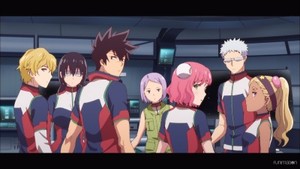 As for the actual story content, the mix of characters seems like a standard one so far for a scenario like this. Thankfully the cast isn't so antagonistic towards each other that they cannot overcome their differences and work together when needed, and that made the scene where everyone works together to help rescue the stranded Aries a beautifully satisfying one. I can easily see Aries' particular brand of ditziness quickly wearing thin if she isn't handled carefully (and really, Aries Spring for a full name? Redundant much?) and Kanata's backstory is maybe a little too cliché, so the cast is not perfect, but they should be functional for this tale. Besides, the whole business about having to hop from planet to planet and gather resources along the way is the selling point of the series, and that is set up quite well. Initial technical merits by studio Lerche are also quite solid. Though the first episode does not have explicit fan service, the camera lingers a little too long on the chests of the bustier female cast members, and the space suits are a little too form-fitting on both genders, for the content to be considered entirely tame, either.