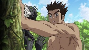 Aside from a fairly unremarkable flash of light, this episode presents the end of civilization as we know it in a very cool and compelling way. The images of stone-statue people frozen in place are far more striking than any nuclear conflict or zombie horde, and the gradual decay of manmade structures is fascinating to watch. For me, though, the highlight of the moment is the unsettling realization that despite getting turned into a rock, Taiju is conscious and aware for the entire thing. The series runs through this sequence at a pretty brisk pace, but there's still enough time to contemplate the horror of being stuck in one's own mind for thousands of years. As far as individual scenes go, it's an early contender for the most memorable thing I've watched this season.