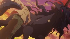 But yeah, the rest of this episode is firmly in “just okay” territory. It wins some points for Taichi and Rin fairly quickly figuring out what's going on – when the Obsidian Horse shows up, they don't waste time saying things like “What's that doing here?” but instead just jump into their version of action, and they're pretty calm about the whole summoned-to-another-world thing as well. The lack of either enthusiasm or histrionics is nice, and it may be due to the fact that Taichi has clearly played his share of RPGs and Rin's willing to trust that he has half a clue about their new world. Their plan to just make the best of things feels relatively solid.