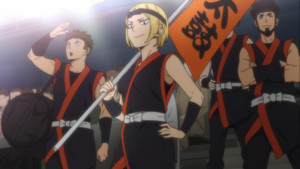 Well, not quite. It's kind of funny that in this very tense volleyball show the single most triumphant moment of the episode is when Tanaka's older sister Saeko (who has a mixed record as a character) shows up with her taiko drum and her traditional-music-playing friends. Not only is the brass band floored by the appearance of (gasp) another band, but everyone is surprised that the instruments involved are so old-fashioned and traditional. It's a wonderful “two can play at that game” moment, and that it helps get Hinata's groove back (even if he just does a plain old serve, much to the audience's chagrin) makes it look like everything may not be lost after all. For a change Saeko represents hope, and that is something that's really needed in this episode because it's not just Hinata who's making mistakes this week, it's even reliable standbys like Nishinoya.