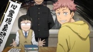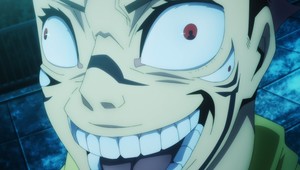 The first episode shows an appreciable comedy angle, with jokes often playing out in the background rather than being the focus. However, what's going to draw in and keep viewers is how it handles its supernatural and action sides. The monster designs shown so far are satisfyingly grotesque and creepy, as are body modifications like the extra eyes which sprout on Yuji's face after he swallows the cursed finger. The animation of the monster scenes, courtesy of studio MAPPA, is quite sharp, especially the well-articulated scenes where Yūji flies in and lands blows on a monster. The presentation and musical support also ramp up the excitement factor quite well. This is helmed by the same director responsible for The God of High School, but I already like what I see in this series much more than what I saw in the first episode of that one.