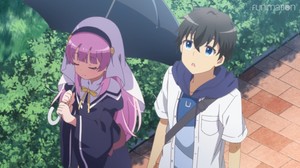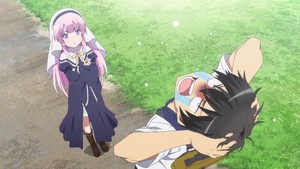 That's more or less the sum of this first episode. Sure, there are portents of a higher concept in the wings, with ominous mention of the world ending by human hands in just 30 days, and some foreshadowing of mysteries surrounding “Odin” and just why she picked this particular weenie of an anime boy to wait out the apocalypse with. But first and foremost the hook (or barrier) for this premiere is seeing a tiny nun voiced by Ayane Sakura smugly declare herself God and get absolutely furious when everyone treats her like an embarrassing toddler. That's the joke, and with a few exceptions where life kicks Narukami in the nads all on its own, the strength of that gag alone will have to decide if you're willing to get onboard Mr. Maeda's Likely Overly Ambitious Wild Ride this time around.