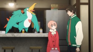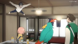 However, as all this is happening, he's also harboring an illegal immigrant pretending to be a ninja and hiding out, and has a giant turquoise talking bird with a big heart on its chest as a pet. It's all very silly, but actually pretty well-integrated with the drama. Jotaro is kind of a clueless goofball, as single anime dads tend to be, and his daughter Rei is obsessed with ninjas, so it meshes together better than you would think. Well, except for the bird. I could live without the bird.