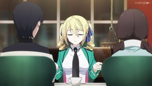 Because of that, I was glad to see that this season is featuring an entirely new regular class member. Because she's American, Angelina is naturally a gorgeous blonde, and given this setting, of course she's a unit commander even though high school-aged. I did find it interesting that she uses magic to make herself appear older when on the job, and the way she totally misjudged Japanese fashion was cute. On the downside, absolutely nothing about her character or behavior makes her the slightest bit convincing as a commander, especially an apparently-respected one who's also one of America's top aces. This is just another case of audience appeal being prioritized over believability.