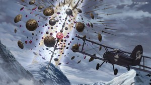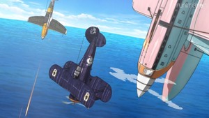 The action scenes are more of a mixed bag. The Pillars present little more than a standard Challenge of the Week kind of threat, and once they got organized the Valkyries did a good job of using teamwork to defeat them. However, that brings me to my biggest issue with the episode: the varied nature of the planes. Clearly someone behind this project is a plane otaku; could be first-time lead director Hirotaka Tokuda, but more likely it's lead writer (and associated novel writer) Tappei Nagatsuki of Re:Zero fame. Whoever is behind it, the series uses a wide variety of planes from across multiple eras for the Valkyries, to the point of being nonsensical about it. Why is Claudia flying a biplane in a battle which also features modern jet fighters and stealth bombers? The other Valkyries look like they're flying World War II-era fighters, too. Unless these planes have some kind of magical boosts, the differences in specs is too enormous; the Gloster Gladiator, which Claudia seems to be flying, had a top speed of 242 mph. Hence scenes showing them leading enemies that even modern-looking jet fighters are having trouble outracing seem ludicrous. The staging of the battles scenes and average-quality animation also struggle to make the fights exciting, especially the earlier ones.