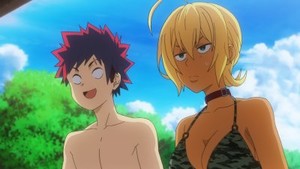 On that subject, I'm not entirely pleased with the characterization of Megumi and Erina here. Erina has softened quite a bit, and that's both positive and logical, but she seems almost to have gone a bit too far – she almost feels like a completely different character. Megumi's personality remains largely intact (her new confidence is, like Erina's kindness, a bit much), but no matter how much stronger she feels in her work, having her wear a bikini, and a relatively skimpy one at that, seems very out of character for her. That requires a level of self-confidence and comfort that no amount of travel is likely to have given her in under a year, and that's not even taking into account the bizarre fact that the entire female cast is apparently allergic to one piece swimsuits.