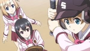 The essential premise here is a combination of two common ones in sports anime: a talented player has decided to drop the sport for Reasons but gets convinced to rethink her decision by both friends and enthusiasts of the sport, and the talented player is attending a school where the club for that sport either doesn't exist or is on hiatus (and so the team will have to be reformed from scratch). In Yomi's case the Reasons are less a personal failing and more a case of her being disillusioned by middle school teammates who lacked her commitment, thus resulting in them losing early in their last tournament. Not yet even hinted at is why the baseball club at Shin Koshigaya is on hiatus, but the first episode is fully invested in establishing the relationship of the titular characters and starting the team-building ball rolling, so presumably this will be detailed in upcoming episodes.