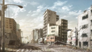 In terms of storytelling, this episode felt simultaneously uninspired and drawn out; you've definitely seen a version of this story before, and Gibiate's only twist on the formula is taking a very long time to get on with it. In terms of art design, the appeal of Amano's designs is pretty much entirely lost in translation to anime, and the show is very light on fluid animation. The ugly CG monsters also mean the show's fight scenes are a serious drag, when they should theoretically be its main sell. The decaying Tokyo backgrounds are this episode's one visual bright spot - detailed and alluring, they manage to convey the decline of humanity in a way that feels consistently beautiful, and more emotionally resonant than any of the show's actual dialogue.